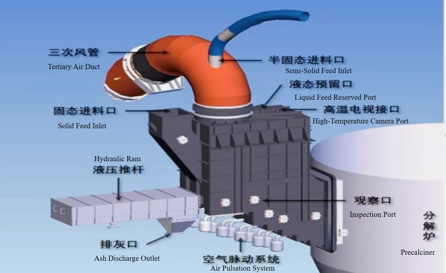 在水泥窑协同固体废物(替代燃料或危废)的传统工艺基础上,将原有固体废物直接入分解炉方式改变为先喂入预烧炉内,经热风(三次风)烘干、有机质燃烧后灰渣与烟气进一步入分解炉继续焚烧,进一步提高固体废物在水泥窑内高温焚烧停留时间,大幅提升固体废物高温焚毁率。同时降低固体废物直接入窑对水泥熟料质量(结块、包料、黄心料)和产量的影响,提高水泥窑处置固体废物量。